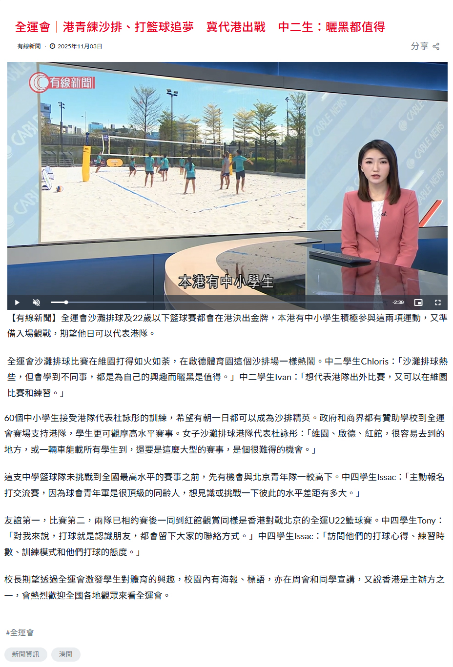 全運會 |港青練沙排、打籃球追夢 冀代港出戰 中二生:曬黑都值得